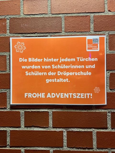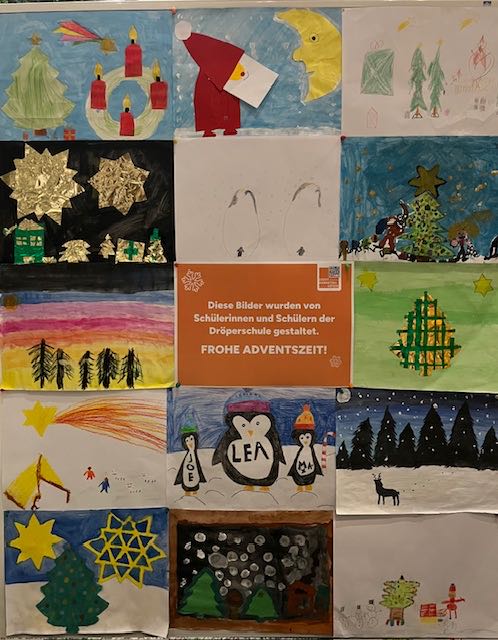Wir sind sehr stolz darauf, dass unsere Schülerinnen und Schüler in diesem Jahr die Bilder für den Adventskalender der Stadt am Oeseder Rathaus erstellen durften. Dieses Projekt bot den Kindern die Möglichkeit, ihre Kreativität einzubringen und Teil eines besonderen städtischen Brauchs zu werden.Mit großem Engagement und viel Freude haben alle Kinder an den Bildern gearbeitet. Als Anerkennung für ihren Einsatz fand am 1. Dezember ein Fototermin mit der Bürgermeisterin Dagmar Bahlo statt. Bei dieser Gelegenheit erhielt die Kombiklasse, stellvertretend für die gesamte Dröperschule, zur Belohnung eine große Kiste mit Süßigkeiten. Zusätzlich bekam jedes Kind eine Tages-Freikarte für die Eisbahn, was für leuchtende Augen und große Begeisterung sorgte.